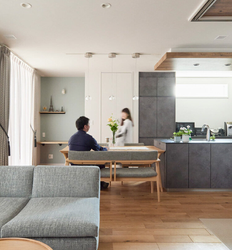 お子さまが誕生し、賃貸アパートから戸建住宅への住み替えを計画されたKさま。奥さまのお母さまとご一緒に、快適に暮らせる二世帯住宅を実現されました。1階のLDKは、ゆったりとした子世帯の団らん空間。北欧モダンをイメージした、ぬくもりのあるインテリアです。