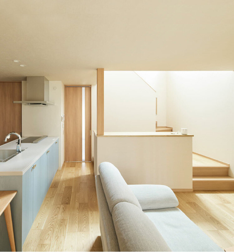「木の質感を生かしたインテリアに」とのご希望から、LDKは明るい木目のフロアや建具で統一し、ナチュラルな雰囲気に。さわやかなブルーグレーのキッチンが彩りを添えています。