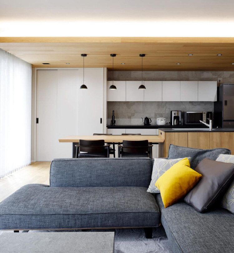 「家族みんなでゆったりと過ごせる広いリビングにしたい」と、約30畳のゆとりあるLDKに。リビングにはテラスに面した大開口を設けているので、明るく開放的です。アイランドキッチンからはDKや隣の和室へも目が届き、家事の合間もお子さまの様子を見守れます。また「今だけでなく、歳を取ってからも心地よく過ごせるように」と、シンプルで飽きのこないインテリアを選ばれました。