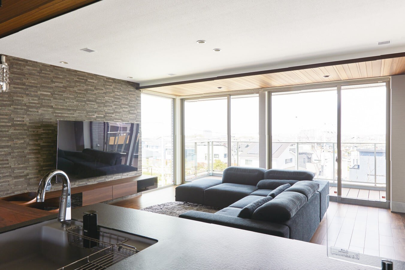 ご家族が集うLDKは、のびのびとくつろげるゆとりの広さにして、室内と外のつながりが感じられるお宅です。3枚のワイドサッシを連ねた大開口や、リビング上の勾配天井がいっそう広がりを生み出しています。