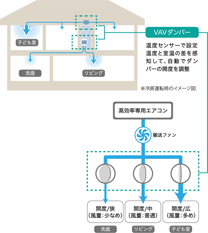 それぞれの部屋に設置された温度センサーが、室温の変化をチェック。その情報を基にVAV(風量調整)ダンパーを自動制御することで、日当たりの変化などによる室温の変化にも対応し、温度差の少ない空間を目指します。