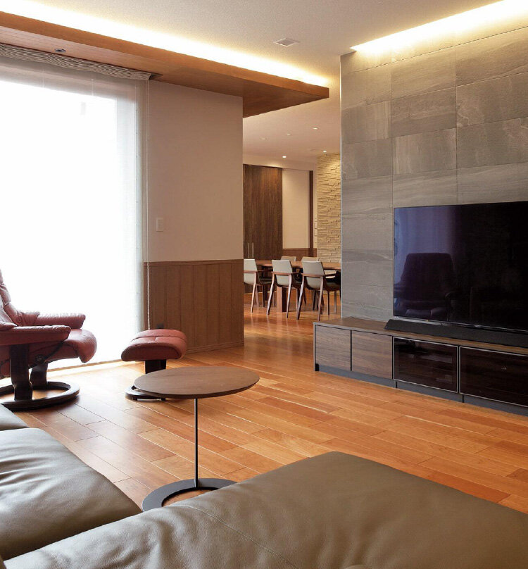 めざされたのは、ご家族やご友人が楽しく集え、おもてなしができるお住まいです。玄関ホールから続くダイニングは、10人が着席できるテーブルを配したゆとりの空間。お料理がお得意な奥さまが腕を振るわれる独立タイプのキッチンは、ワイドなカウンターや収納にこだわられました。くつろぎ感あふれるリビングは、壁の一面をタイル張りにし、間接照明ですっきりと演出。一角にはバーコーナーも設けられました。
