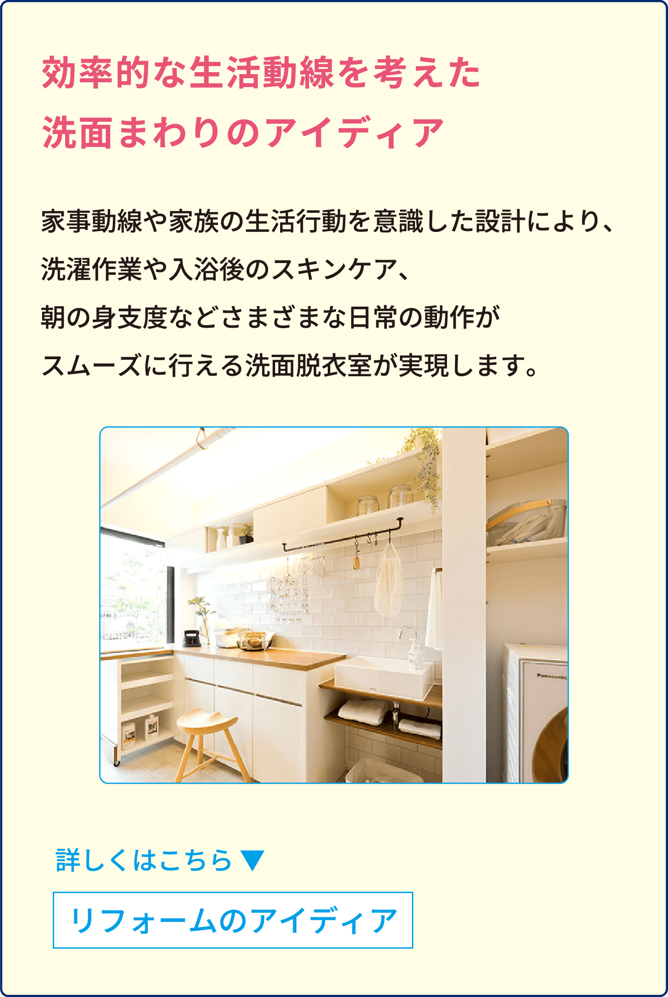 洗面室に、下着やパジャマなどの衣類をしまえる収納を計画すると、入浴時の着替えがスムーズにできます。