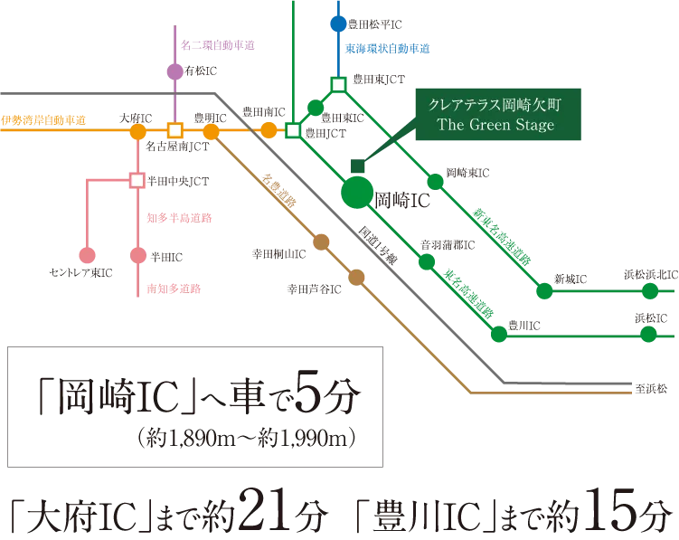 ※自転車分数、⾞の所要時間は⽇中平常時に実測したものです。信号や渋滞、交通量の状況によって異なります。
