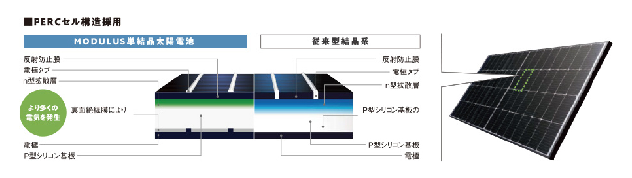 PERCセル構造により従来の結晶系よりも電荷消失を低減することで発電量が多く得られます。