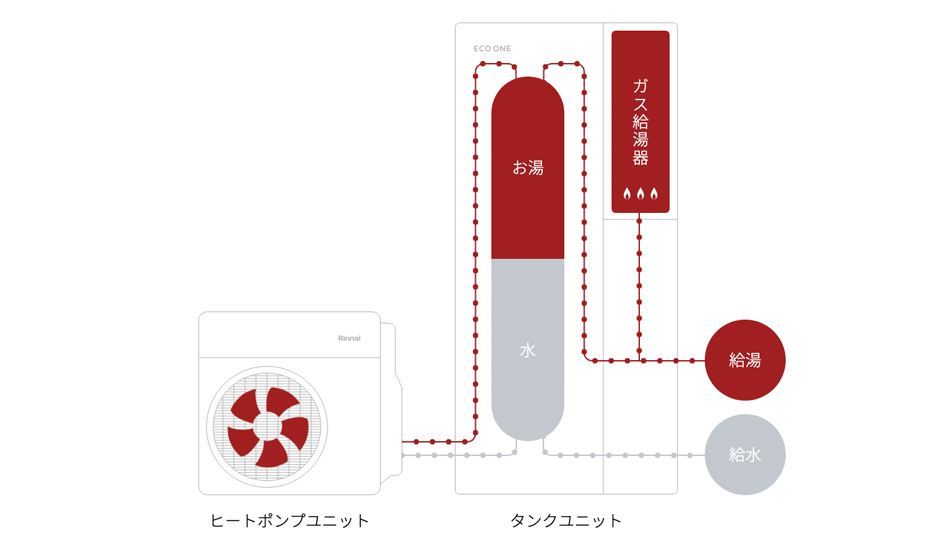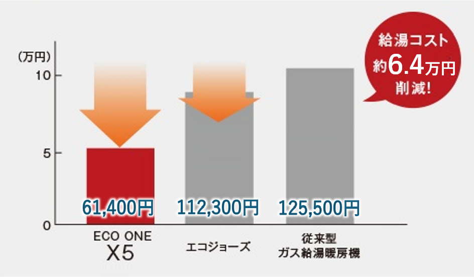 ハイブリッド給湯器「ECO ONE X5」は電気とガスを使用しながら状況に合わせて、効果的に使い分ける給湯器です。給湯光熱費を大幅に削減できます。