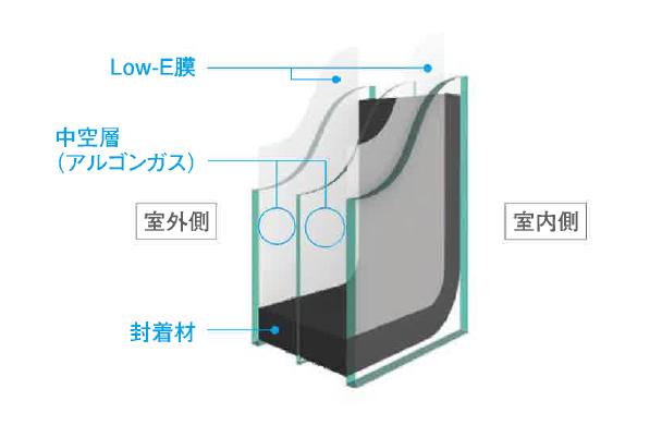 Low-Eガラスを2枚、一般ガラス1枚、合計3枚のガラスを使用したトリプルガラス構造の断熱ガラスを採。中空層を2層作り、アルゴンガスを封入することで、高い断熱性能を実現しました。開口部の遮熱・断熱性能を上げることは、住まいを快適にするとともに、冷暖房負荷を軽減することで省エネによるCO2削減効果が期待できます。