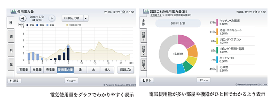 電気使用量・発電量をはじめ、項目別に見える化。電気使用量の多い部屋や機器がひと目でわかるので、ムダ遣いが発見しやすく、家族の節電意識も高まります。