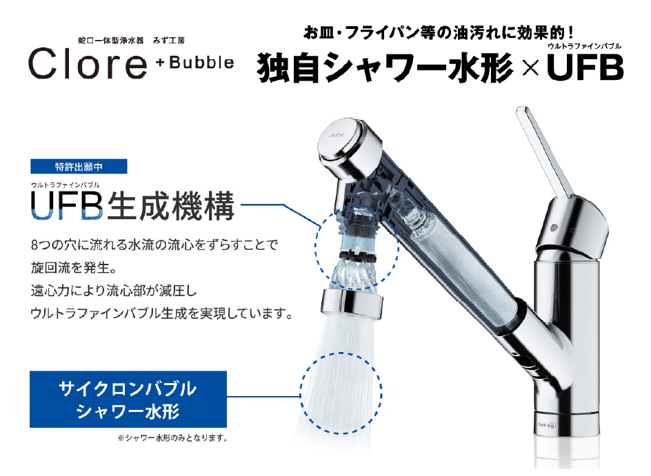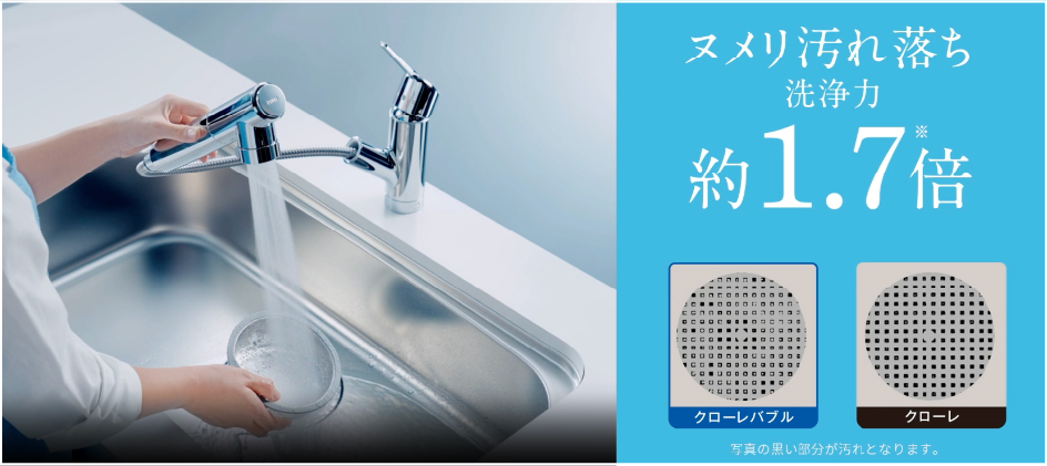 クローレバブルは水流1mlあたり約900万個※1のウルトラファインバブルを作り出します。様々な「洗浄」の分野で活用されるウルトラファインバブル特有の作用を応用したサイクロンバブルシャワー水形が汚れをしっかり落とします。