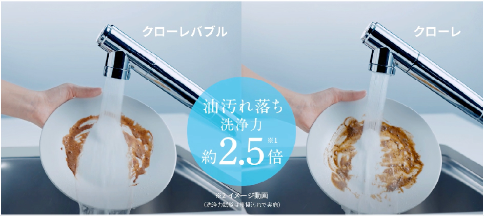 ※クローレバブルのシャワー水形と同シリーズ:クローレのシャワー水形を使用し、各々水形にて疑似汚れ(染料で着色したマーガリン)を塗布したガラス板を1分間放置後に水流(吐水水量:3.9L/min・吐水温度20℃)を30秒間当てて汚れ落ちの試験をした。クローレバブルと同シリーズ:クローレのシャワー水形でそれぞれ疑似汚れが落ちた面積比率を画像解析ソフト(ImageJ)にて算出した値を結果とした。算出用画像の二値化処理における輝度しきい値は、画像と汚れ範囲が目視で一致するように輝度しきい値を設定し、その輝度しきい値での各々面積を測定し比率を算出。それから洗浄率を算出し、クロ―レバブル洗浄率/同シリーズ:クローレ洗浄率=約2.5倍の結果を確認。吐水水量(最適流量):3.9L/minはバルブ工業会の最適流量の節湯基準に基づく。(2024年5月タカギ開発調べ)