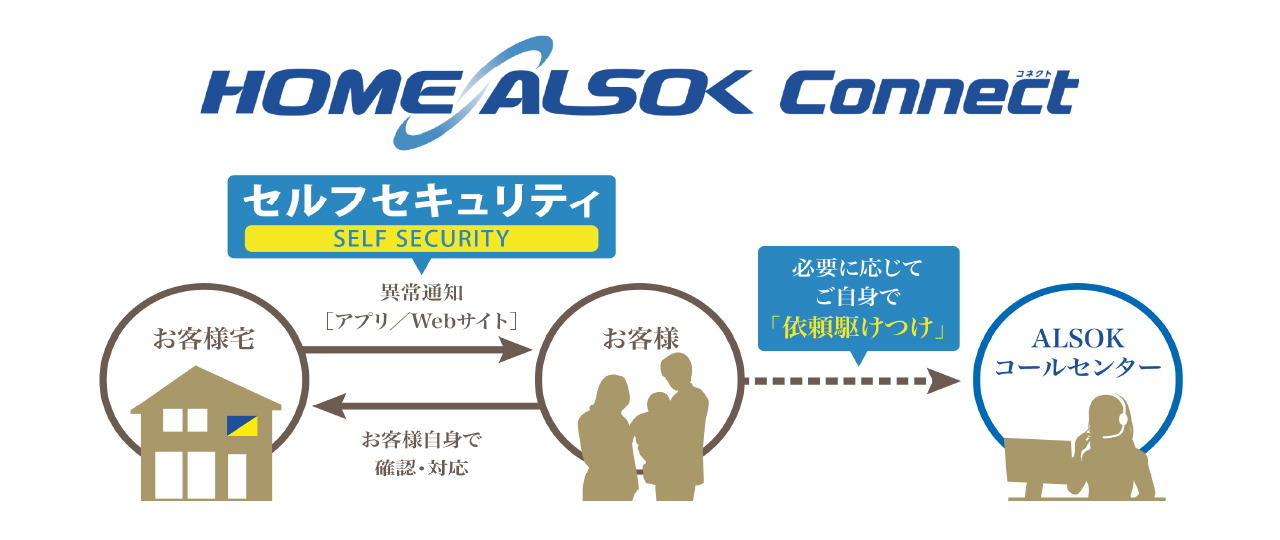各種センサーが異常を感知するとお客様のスマホなどに通知し、お客様ご自身で状況をご確認いただきます。必要に応じてALSOKへ「依頼駆けつけ」を行っていただくと、ガードマンが急行します。