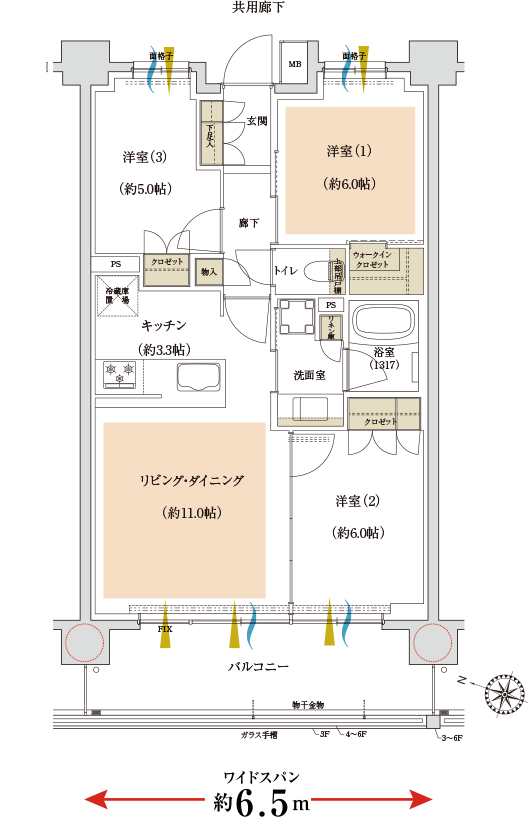Btype 3LDK+WIC 専有面積 66.76㎡ バルコニー面積 11.70㎡ WIC:ウォークインクロゼット ワイドスパンの開放感と充実した収納が魅力の3LDKプラン 西向きワイドスパン住戸 大型ウォークインクロゼット 約11.0帖のLD 廊下物入 スライドウォールドア Bタイプ平面詳細図 通風 採光 床暖房範囲 収納範囲 アウトフレーム工法 家事動線 PDFで開く 間取り一覧に戻る