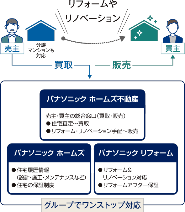 私たちは、パナソニック ホームズグループの不動産会社です。買取、販売、リフォームやリノベーションなどグループでワンストップで対応が可能です。