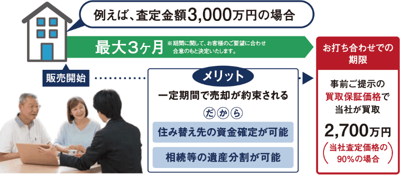 査定価格をご提示後、当社へお任せいただき販売を開始。お打ち合わせでの期限を経過しても売却に至らなかった場合は買取保証価格※(査定価格の90%を上限)にて、当社が買取らせていただきます。