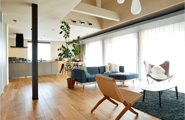 「将来にわたってワンフロアで快適に暮らせる家に」と、平屋のご新居を実現されたOさま。室内と外のつながりを感じられる、開放的な間取りをご希望されました。ご家族が集うLDKは、のびのびとくつろげるゆとりの広さに。3枚のワイドサッシを連ねた大開口や、リビング上の勾配天井がいっそう広がりを生み出しています。ご夫妻が特にこだわられたのがインテリアです。LDKは、北欧風をベースに和を組み合わせたジャパンディスタイル。シンプルながらも洗練された家具や照明をセレクトされています。
