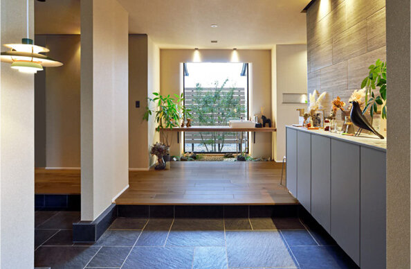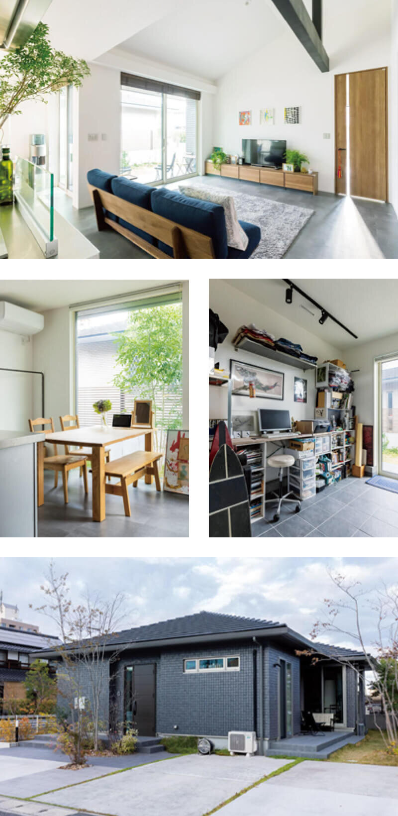 玄関の続きには個室として使える土間を計画。服飾関係のお仕事をされているご主人がここでデザインや生地の裁断をしたり、趣味である絵を描いたり、「家の中に集中して作業できるスペースがあるのはいいですね」と話されます。住み心地について「夏は涼しく冬は暖かく快適。動線もいいし、何も不満を感じません」とご主人。奥さまは「階段がないのでからだがラクだし掃除もしやすい。子どもが独立して夫婦ふたりの暮らしになってもちょうどいい家だと思います」と平屋のよさを実感されているご様子。素敵なお住まいで集いや趣味の時間を満喫しておられます。