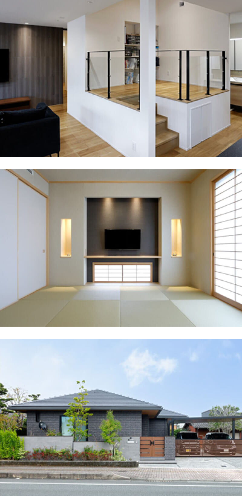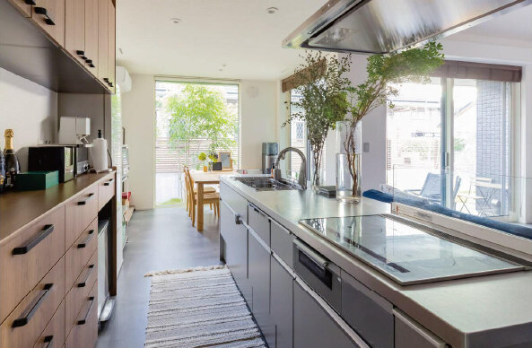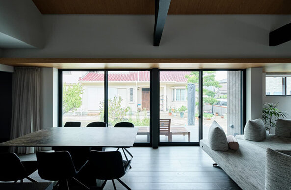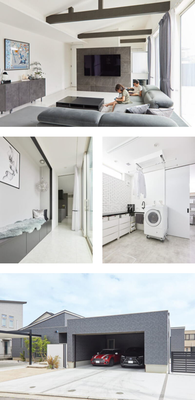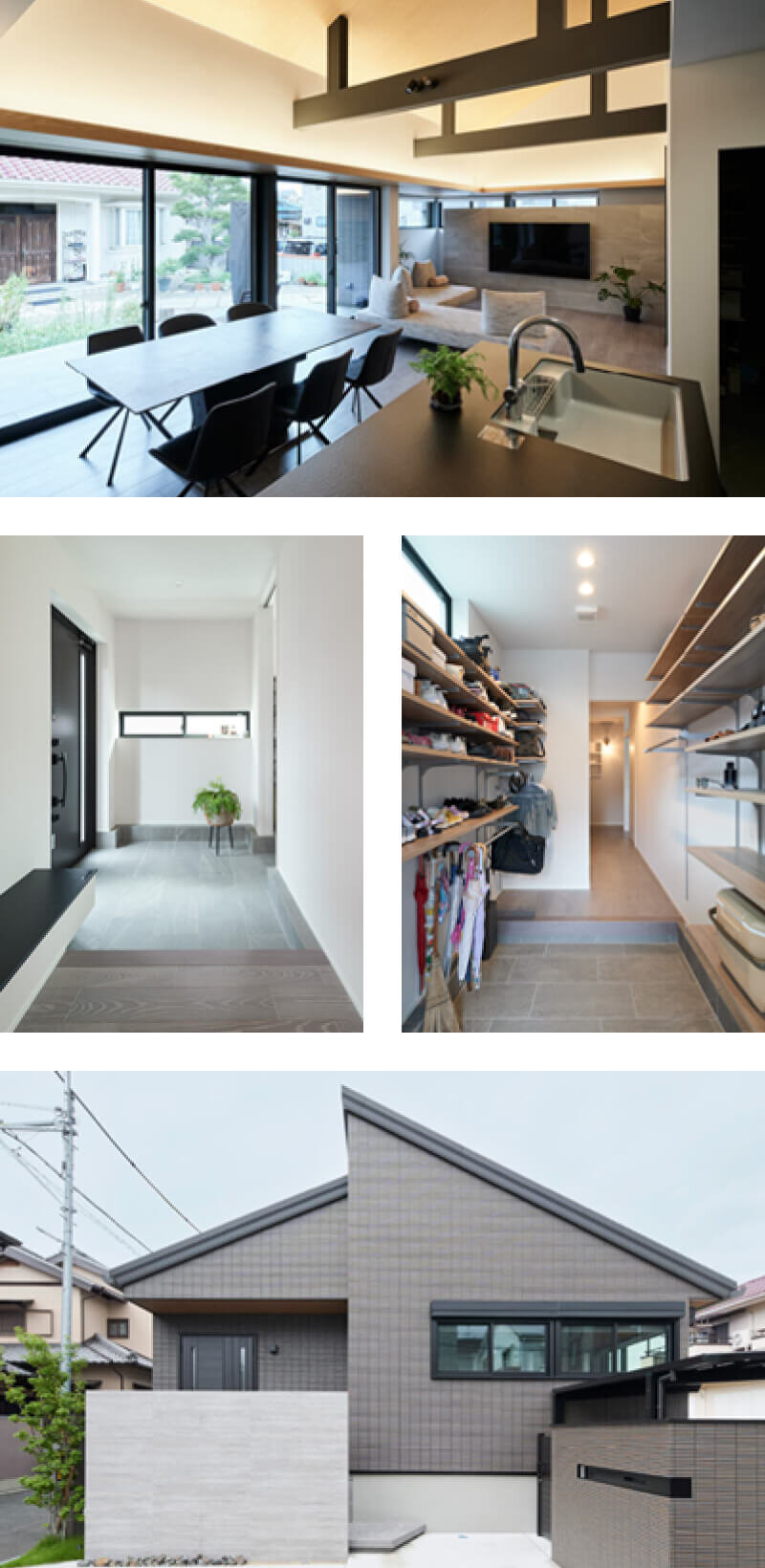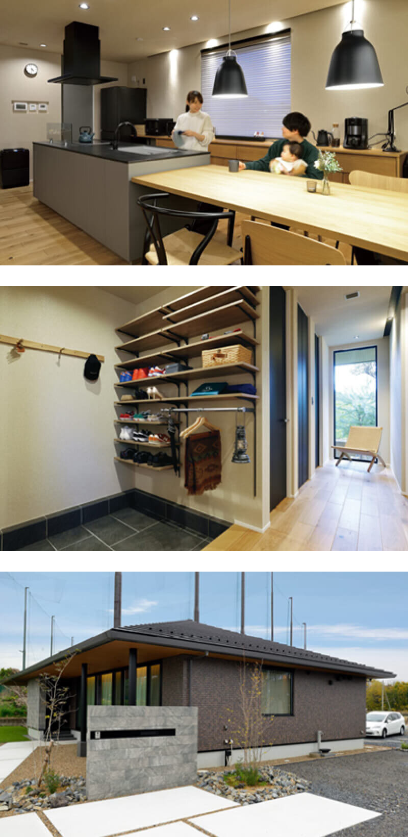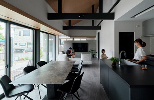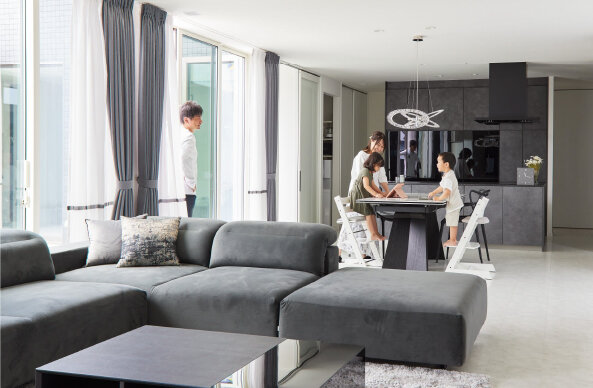 ご実家の敷地の一角に、家族がのびのびと過ごせる平屋の住まいを建てられたMさま。「リビングをできるだけ広く」とのご希望から実現したのが、開放感いっぱいの大空間でした。平屋ならではのダイナミックな勾配天井と、テラスや庭へつながる大開口が、縦横への広がりを生み出しています。インテリアは、グレーを基調に黒を効かせてスタイリッシュに。梁や下り天井などで変化を付けつつ、ノイズをなくしてすっきりとした空間に仕上げました。また、生活感を出さないようにキッチンの家電はすべてパントリーに格納。リビングにはファミリー収納を設けて、いつも片付いた空間が保てる工夫を取り入れました。