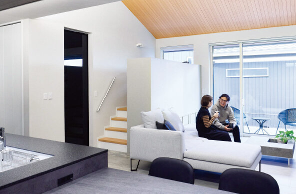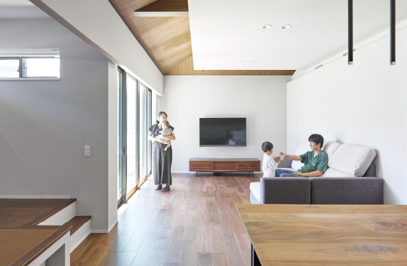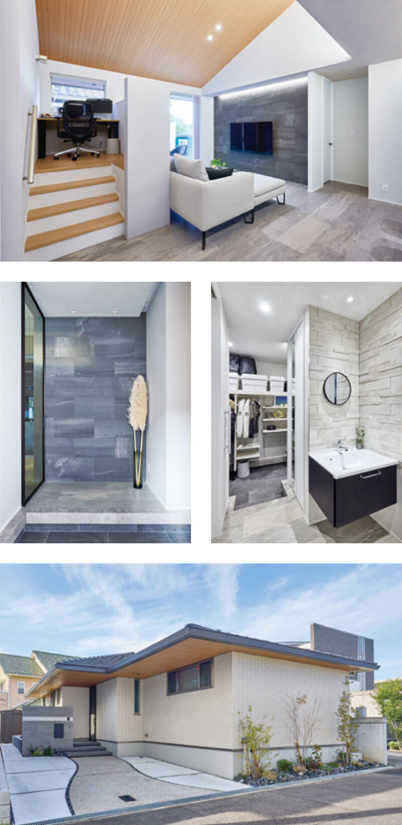 LDKはダイナミックな勾配天井を生かした、開放的な空間です。 「スタイリッシュで居心地がいい空間にしたい」と、グレーを基調としたシンプルなインテリアに。リビングの一角には、スキップフロアを計画。壁でほどよく仕切った半個室タイプの空間で、在宅ワークに活用されています。 また、外への広がりを感じられるよう、リビングからフラットに続くテラスを設けています。スムーズな生活動線や家事のしやすさにもこだわられました。玄関のシューズインクロークや手洗いスペースを通って室内へ。また、洗面室とは別に脱衣室とランドリールームを設けて、近くにクローゼットを配置。「お気に入りの洗濯動線です」とご主人。ものをしっかり隠せる収納を各所に設けて、生活感が出ないように配慮しています。