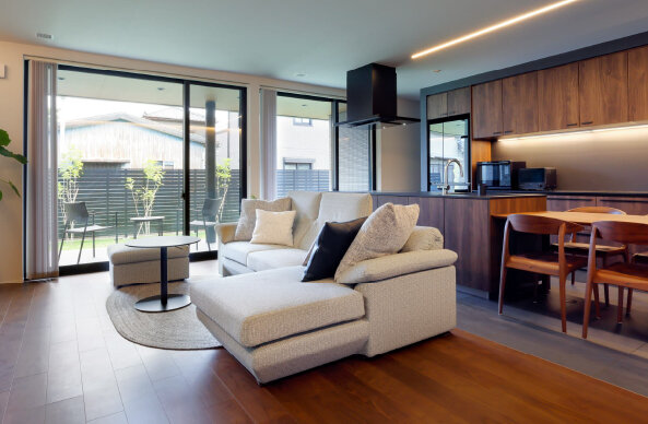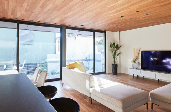 木の質感を生かしたインテリアは、上質な家具を合わせてスタイリッシュに。間接照明でホテルのようなくつろぎを演出しています。家事のしやすさにも配慮し、キッチンと洗面室、クローゼットがつながる回遊動線に。洗面室は室内干しができる広さを確保しました。子ども室はDKの続きに配置し、リビング横にはモダンな和室を設けています。「子どもが部屋にいてもLDKから見守れて安心。和室も子どものお世話に重宝しています」とMさまはおっしゃいます。