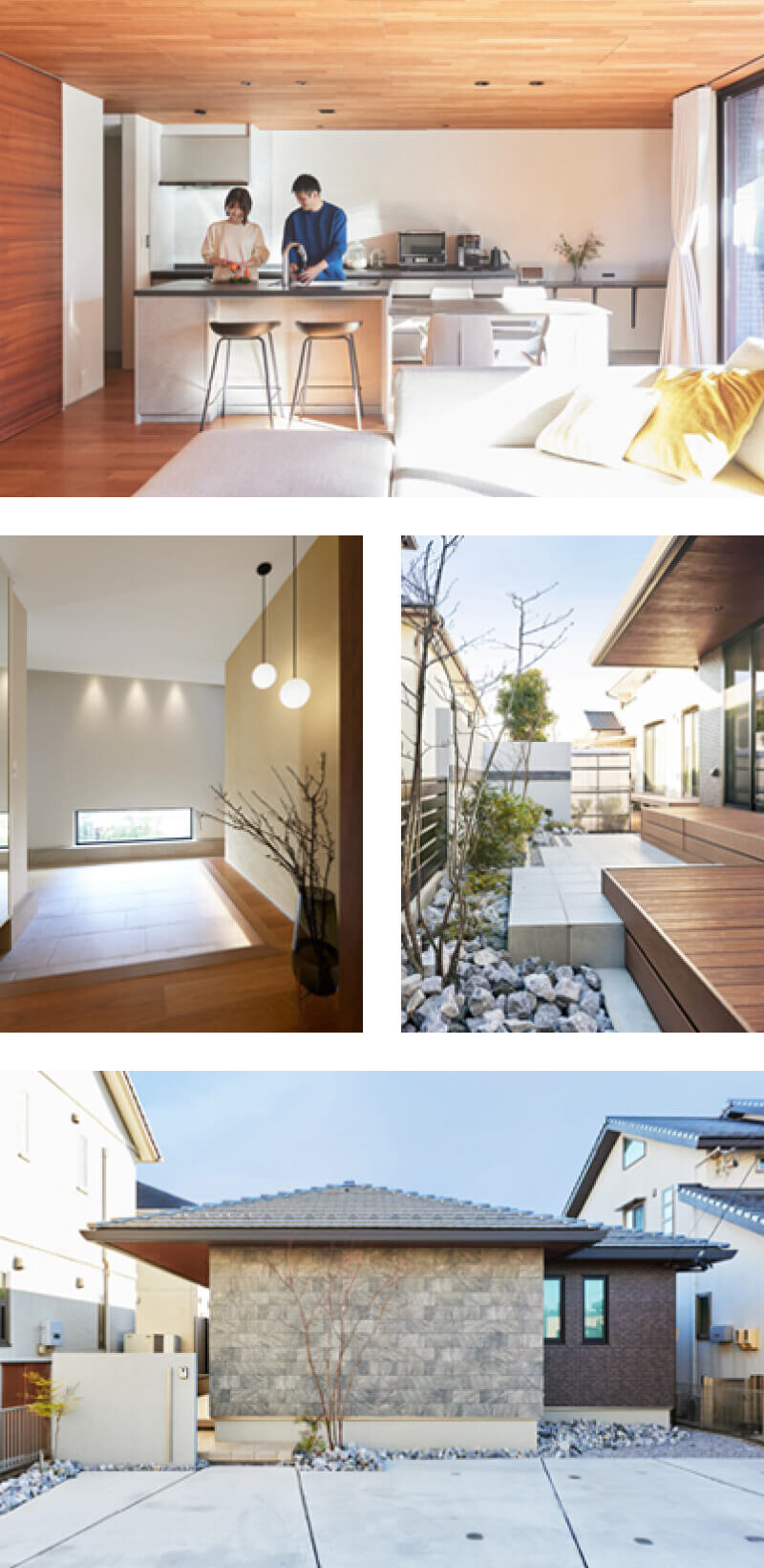 落ち着いた住宅地の一角に立つ、ゆとりのある平屋のMさま邸。家づくりにあたり「人目を気にせず、子どもたちがのびのびと遊べるように」と希望されました。そこで、ビルトインガレージと建物の間に、中庭のテラスを設けたプランをご提案。テラスに面したLDKは、光がたっぷりと差し込み、視界が外へ広がって開放感いっぱいです。アイランドキッチンからも、リビングやテラスにいるお子さまに目が届いて安心です。リビングの奥には、隠れ家のような畳コーナーも。玄関からLDKへと続く廊下にはテラスを眺めながらくつろげるコーナーをつくるなど、楽しい居場所を設けました。