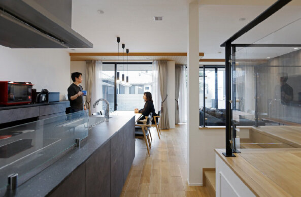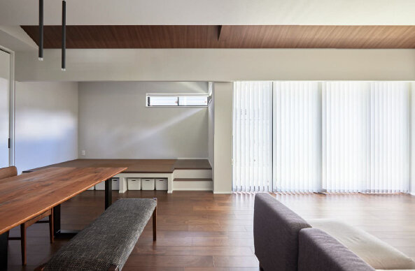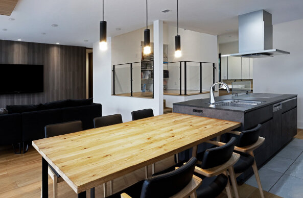 「ライフスタイルの変化に対応できる住まいにしたい」と考えられたKさま。お子さまの成長に伴って柔軟に使える平屋の住まいをご希望されました。広々としたLDKの中心には、スキップフロアをプランニング。ここでお子さまが勉強したり遊んだり、奥さまが趣味の時間を過ごしたり。「子どもたちが目の届くところにいて安心ですし、子どもが巣立った後はワーキングスペースになります」。アイランドキッチンの背面にはパントリーを設けて、いつも美しく保てるように。スキップフロアの下も収納として活用しています。
