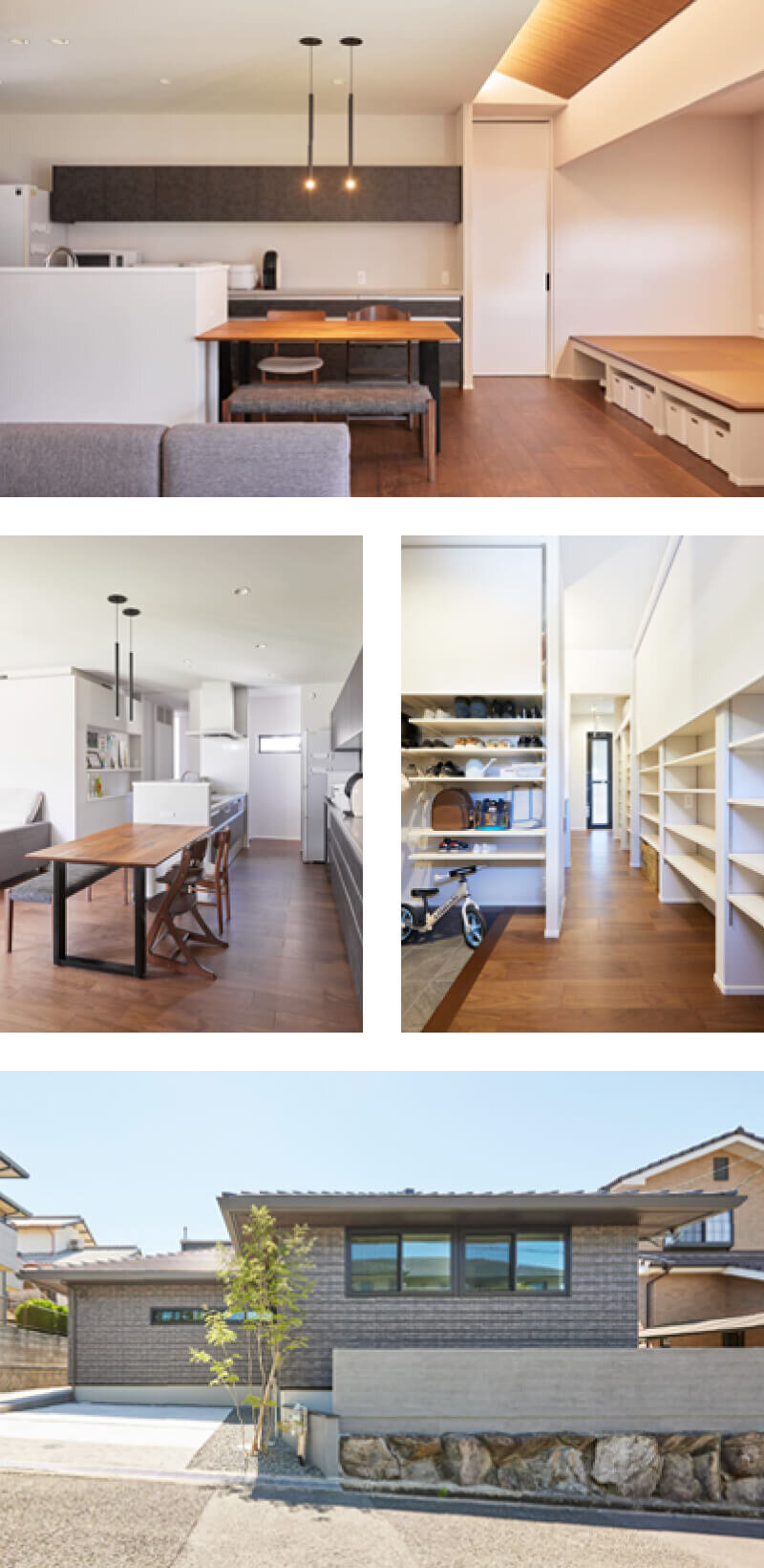 子育て中で共働きのご夫妻は、「子どもたちを見守れる団らん空間」「家事がスムーズにできる動線」がご希望でした。ご家族が一緒に過ごすLDKをできるだけ広くし、一角には小上がりの畳コーナーを併設。お子さまがお昼寝をしたり遊んだりできるスペースとして活用されています。