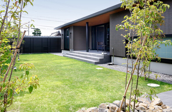 市街地からほど近い、人気のエリアに立つMさま邸。分譲地の3区画を使ったゆとりのある敷地に、森のような庭と邸宅感あふれるご新居を実現されました。
