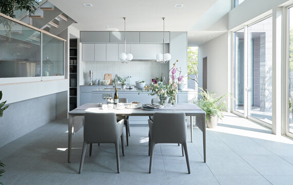 上階の重さを支える必要がないため、柱の少ない大空間や大開口をつくりやすく、天井も高くできるので、横にも縦にも広がりのある開放的な空間を実現できます。