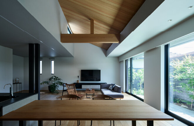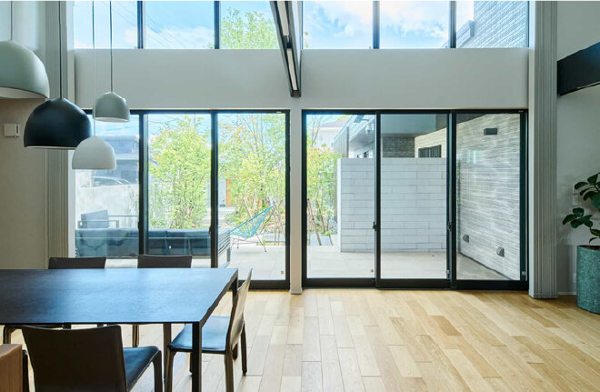 庭や周囲の自然に面した窓を大きくとることで、自然がより近くに感じられ、視線が外へ抜けることで空間が広く感じられます。
