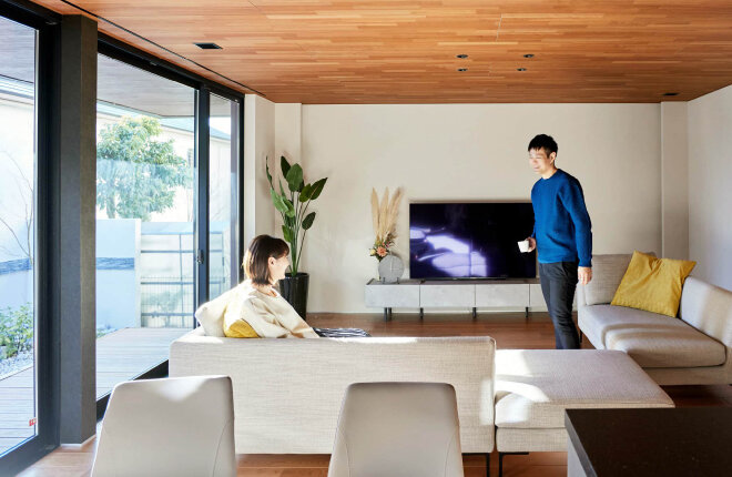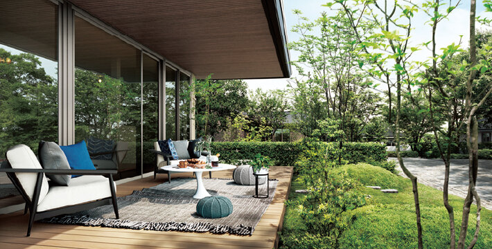 テラスの軒を深くすることで、夏の強い日差しを遮り、雨風の影響を少なくすることができます。パナソニック ホームズは3mもの深い軒が可能。快適なテラスでリゾート気分を味わえます。
