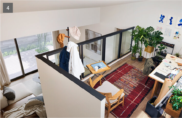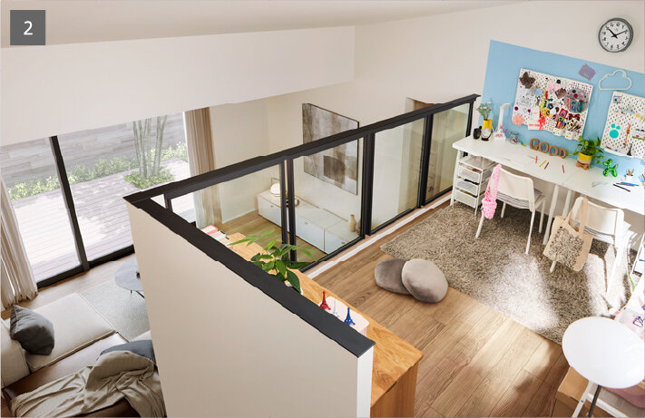 壁で仕切らなくても、床の高さを変えることで、空間をゆるやかに区切ることができます。オープンでありながら、趣味や仕事に集中しやすい適度なこもり感があるので、個室とは一味違う心地いい居場所に。ライフステージの変化に合わせて、多用途に使えるのも魅力です。