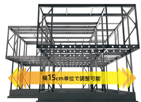 重量鉄骨ラーメン構造、制震重鉄ハイブリッド構造、制震鉄骨軸組構造に15cm単位の設計モジュールを採用。都市部の限られた敷地や変形敷地でも、境界線いっぱいまで建築できるためバランスのとれた建物配置ができ、さらに広々とした空間を確保できます。