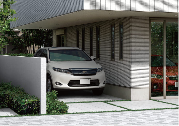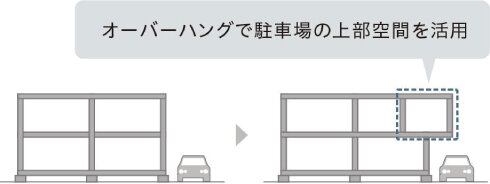 重量鉄骨ラーメン構造は、上層階の空中への張り出し幅が3.6mまで可能。上層階にはプラスαの空間であるオーバーハングルームがつくれると同時に、張り出し部分の下はガレージなどに利用できます。