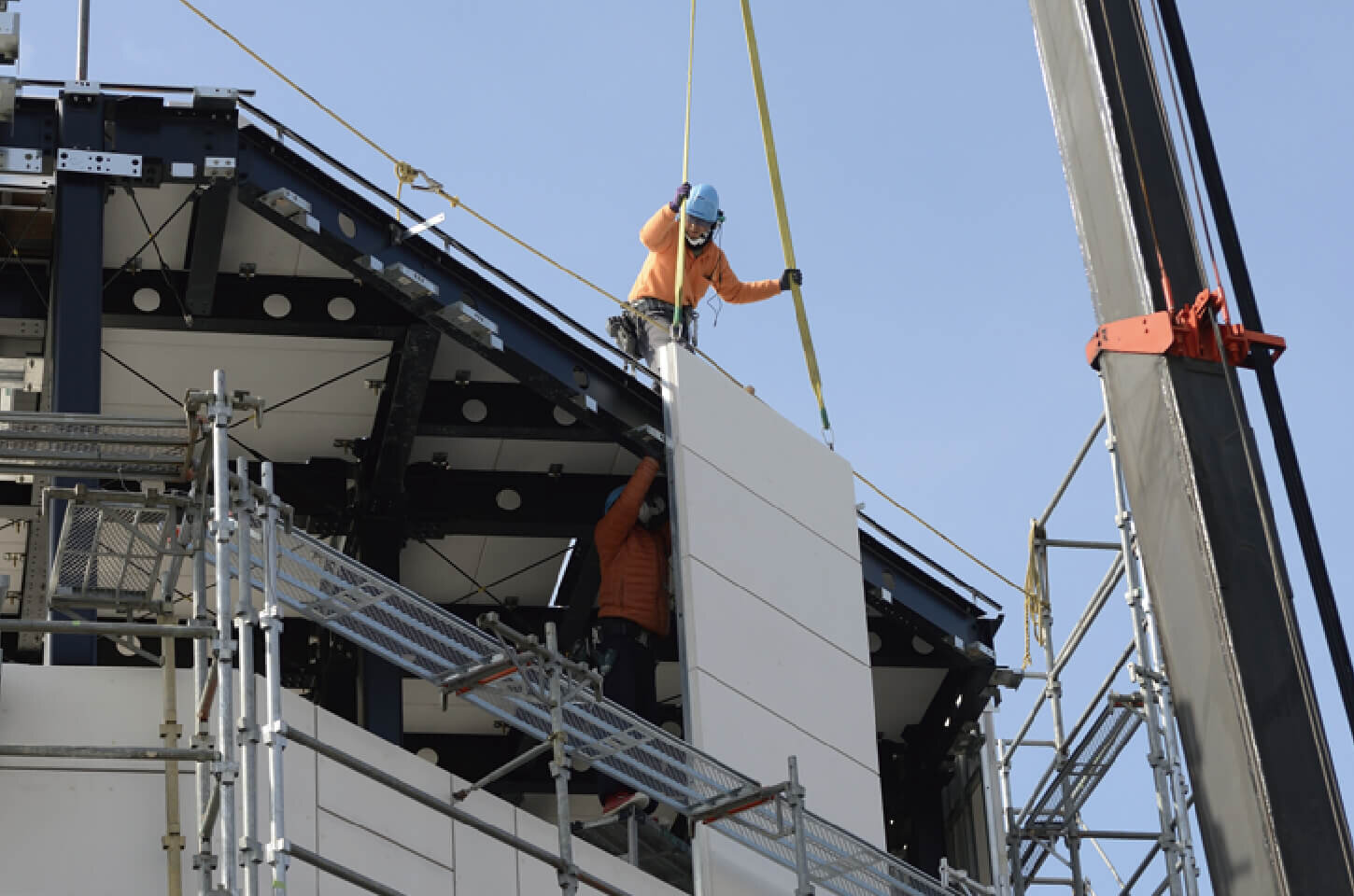 工場で生産された外壁パネルをトラックで現場に運び、現場ではクレーンを使って架構体に取り付けていくため工期の短縮が可能。外壁の取り付けには、超高層ビルと同じ考え方のカーテンウォール工法を採用。地震の横揺れやねじれにも柔軟に追従します。